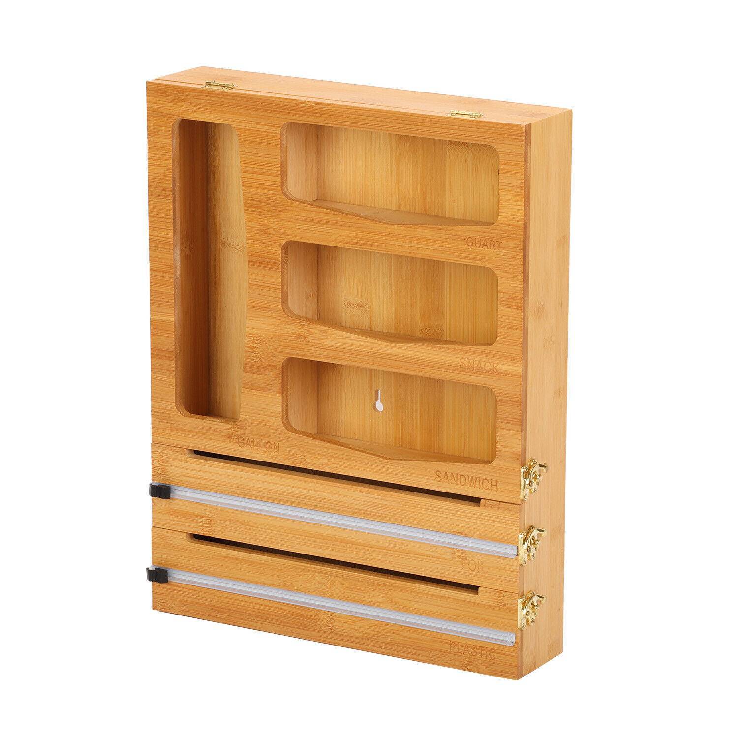 【 BAMBOO MATERIAL AND DURABLE】 This 2 in 1 ziplock bag storage and foil organizer is made of pure natural bamboo, which is very strong and durable, and has smooth edges that won't scratch your hands and drawers. Waterproof and easy to clean, the plastic wrap is cut flat and easy to find. The storage bag is also easy to access.
